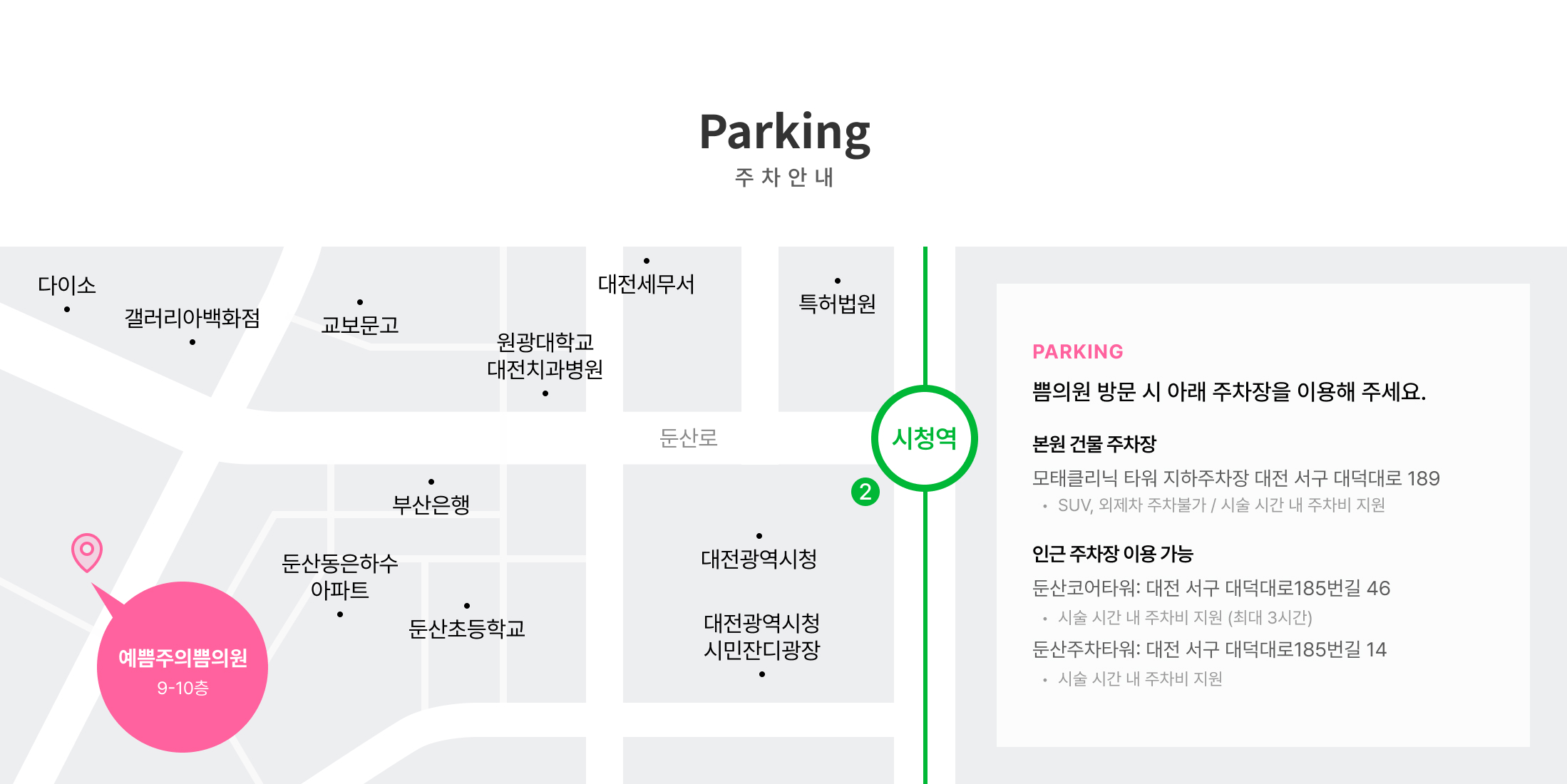 대전예쁨주의쁨의원은 1호선 정부청사역 2번 출구 도보 10분 거리에 위치한 피부과의원으로 평일 밤 9시까지 야간진료로 언제나 편안하게 진료 받으실 수 있습니다. 042-487-3888으로 편하게 예약하세요.